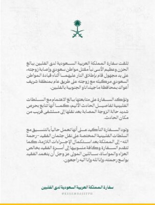 تلقت سفارة المملكة العربية السعودية لدى الفلبين ببالغ الحزن وعظيم الأسى نبأ مقتل مواطن سعودى وإصابة زوجته، على يد مجهول قام بإطلاق النار عليهم أثناء قيادة المواطن