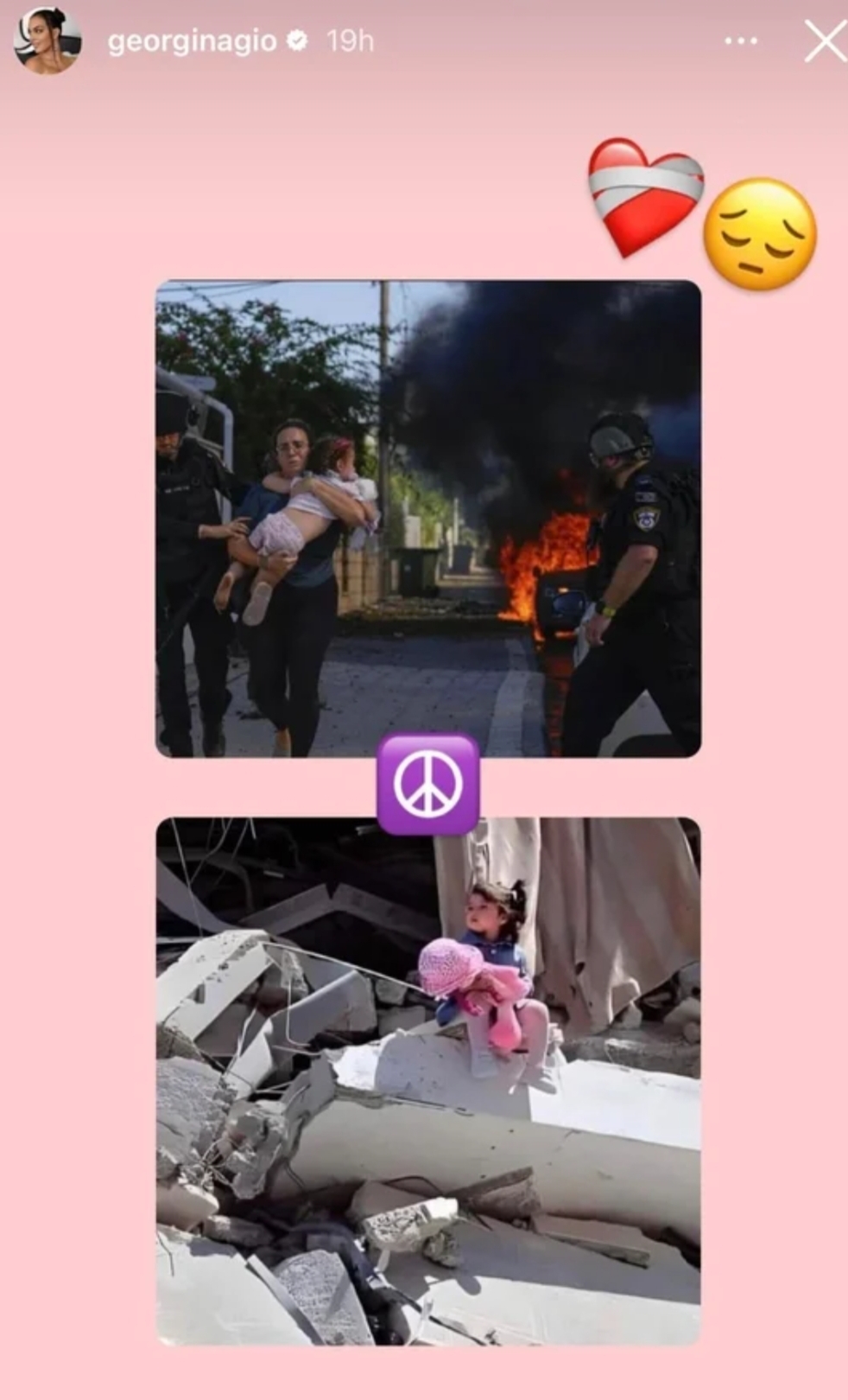 قررت جورجينا رودريغيز مشاركة أفكارها التي تدعو إلى السلام، عبر خاصية الاستوري على حسابها بتطبيق إنستغرام، فيما التزم شريكها كريستيانو رونالدو الصمت من جانبه ولم يعلق على الأحداث الجارية في غزة.