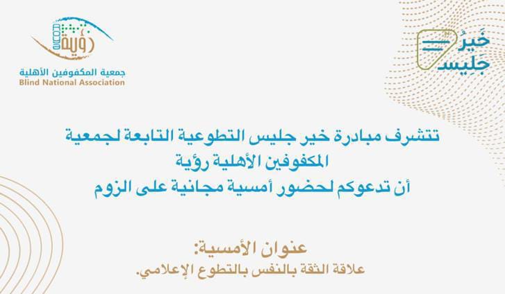 تتشرف مبادرة خير جليس التطوعية، التابعة لجمعية المكفوفين الأهلية رؤية ، أن تدعوكم لحضور الأمسية المجانية عبر منصة زووم، بعنوان (الثقة بالنفس وعلاقتها بالتطوع الإعلامي) ، والتي تقدمها المدربة: الأستاذة . فوزية الوثلان ،وذلك يوم السبت الموافق: ١٤ أكتوبر. من الساعة: ٧:٠٠ م وحتى الساعة: ٩:٠٠ م.