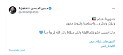 ونشر حسين الجسمي تدوينة قصيرة عبر حسابه الشخصي على منصة إكس، تويتر سابقاً، جاء نصها: “جمهورنا نحبكم.. ونقدّر ونحترم وإحساسنا وقلوبنا معهم. ما لنا نصيب نشوفكم الليلة ولكن ملقانا بإذن الله قريبًا جدًا”. وأرفق رمز تعبيري لعلم الكويت بجانبها.