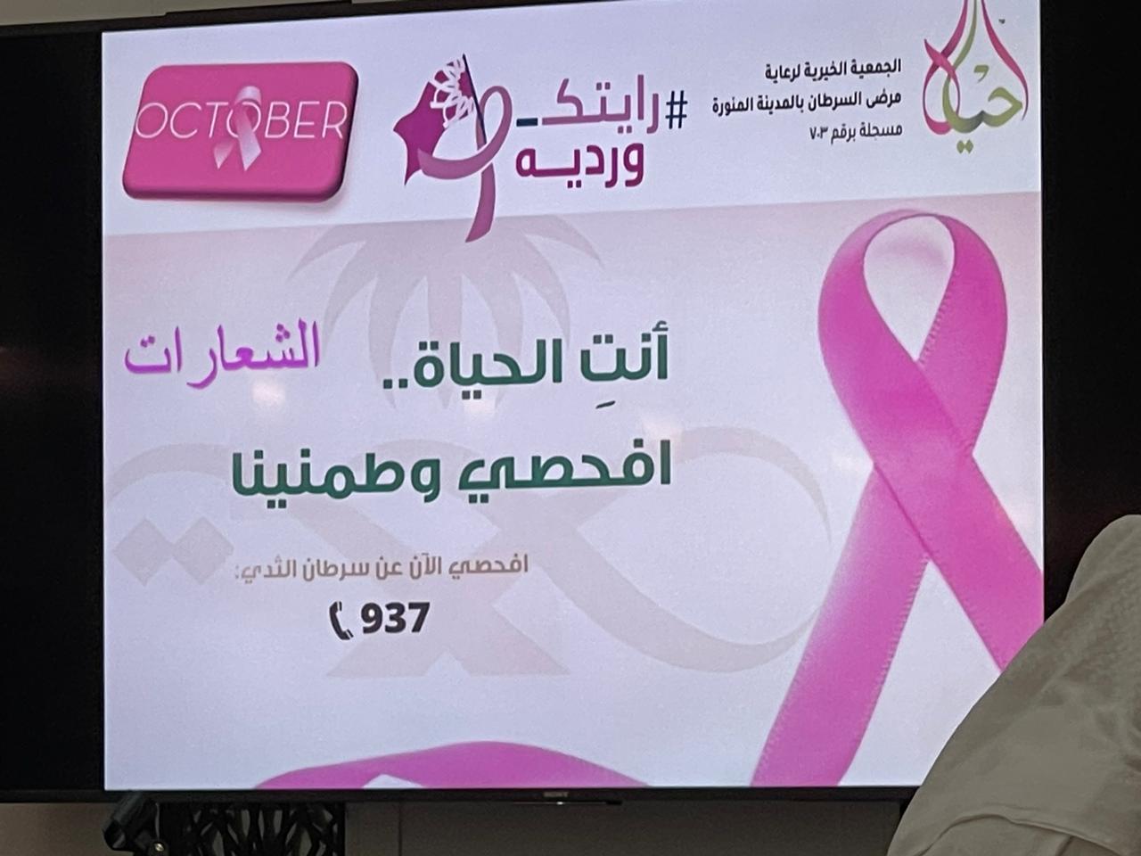 – الاستشارية تغريد البصري قدمت محاور خمس : (سرطان الثدي إحصائيات،الهدف من شهر التوعية، كيف بدأت الحملة الوطنية للكشف المبكر، الوقاية من سرطان الثدي و المسببات ، وسائل الكشف المبكر عن سرطان الثدي “الماموغراما”).