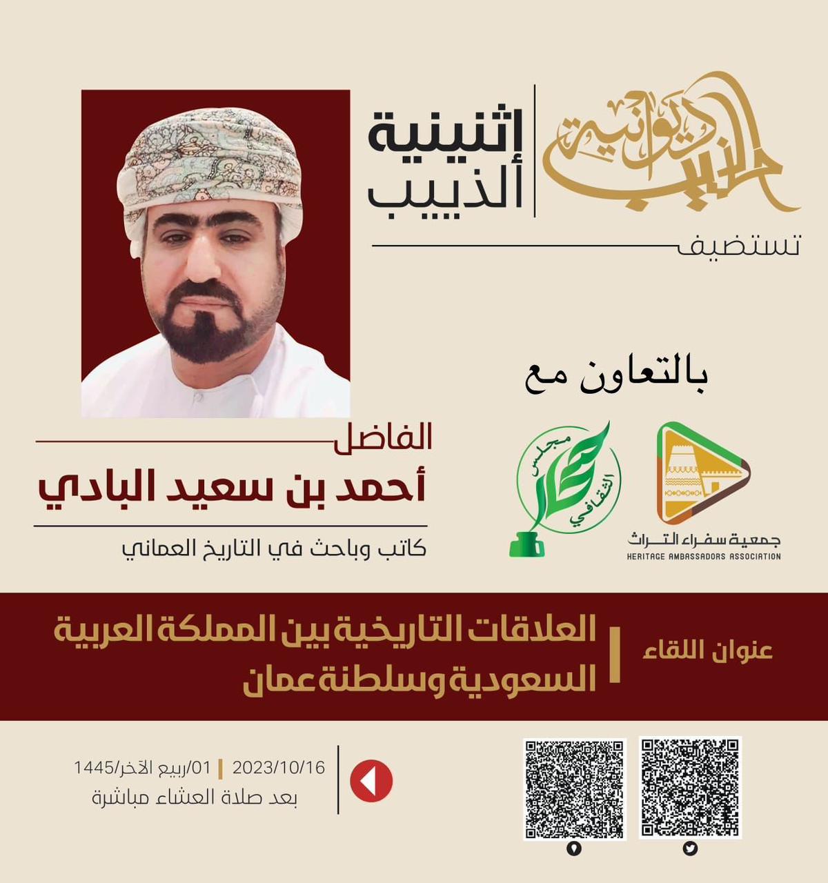 تنظم “إثنينة الذييب” و”جمعية سفراء التراث” الاثنين المقبل لقاءً مهمًّا حول “العلاقات التاريخية بين المملكة العربية السعودية وسلطنة عمان”. يتحدث فيها الكاتب والباحث العماني أحمد بن سعيد البادي من مجلس صحار الثقافي، والمتخصص في الشأن التاريخي السعودي العماني، بمشاركة عدد من الكتاب والباحثين السعوديين والعُمانيين.