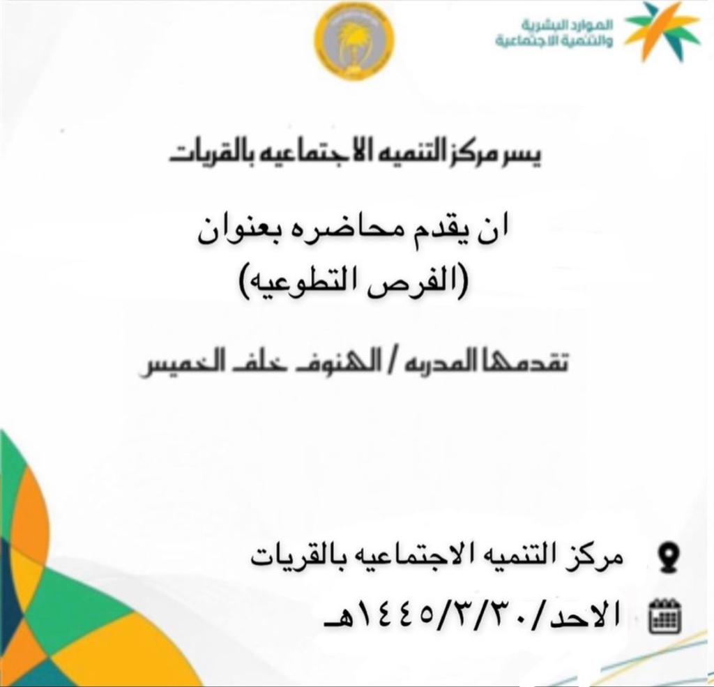 أقام مركز التنمية الاجتماعية بمحافظة القريات دورة تدريبية عن الفرص التطوعية لمنسوبات مركز التنمية الاجتماعية قدمتها المدربة / الهنوف خلف الخميس ، والتي تحدثت عن المتطوعين والجهات التطوعية ، وعن كيفيك فتح حساب للمتطوع ، وكيفية دخول المتطوع للمنصة والبحث عن اسم الفرصة والمنطقة ، والجهة المسؤلة عن الفرصة ، بالاضافة غلى الحديث عن العمر المناسب للفرصة لكي يتمكن من الانضمام إليها .