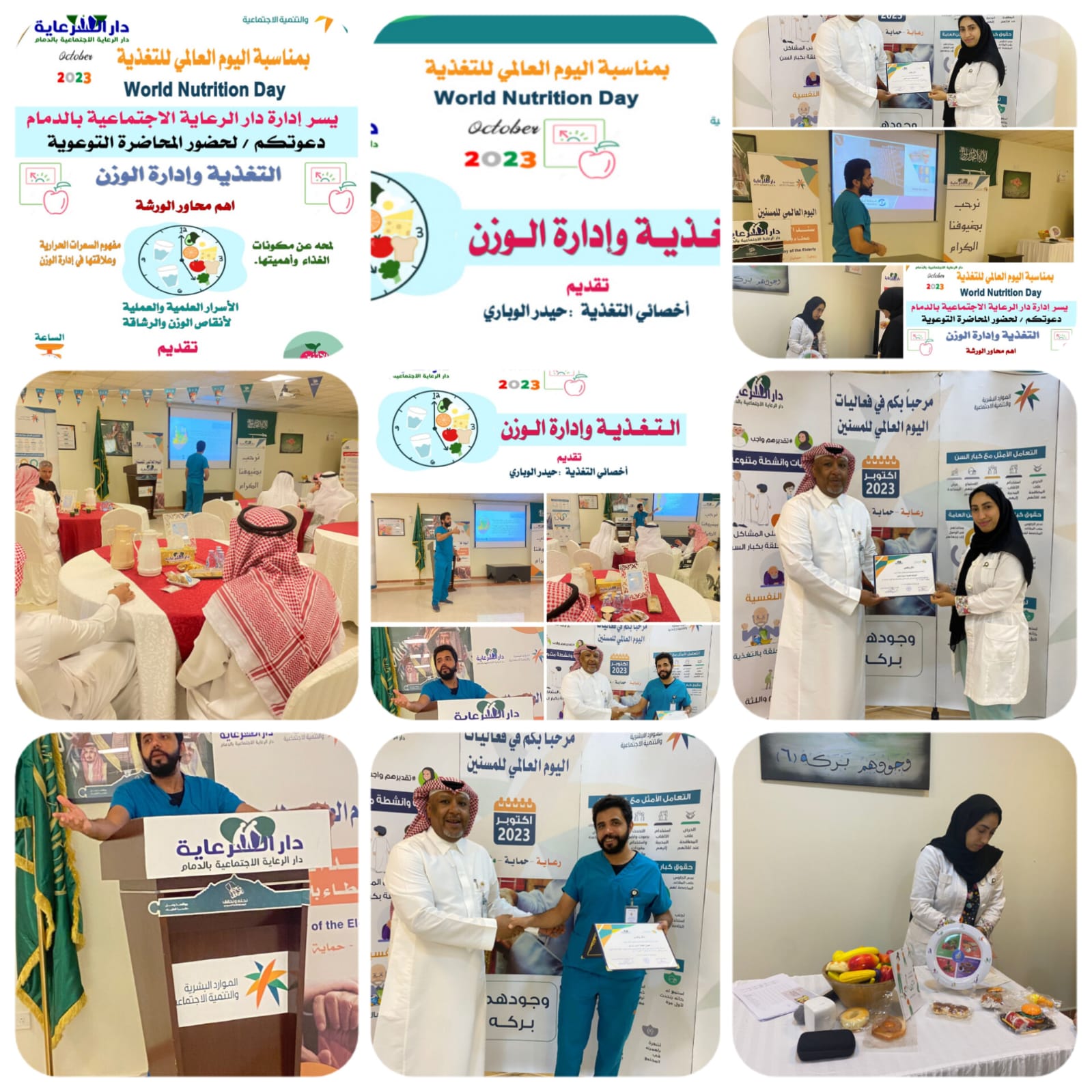 بمناسبة اليوم العالمي للتغذية الذي يصادف 16 أكتوبر من كل عام أقيمت بدار الرعاية الاجتماعية بالدمام التابعة لفرع وزارة الموارد البشرية والتنمية الاجتماعية بالمنطقة الشرقية محاضرة توعوية بعنوان ” التغذية وإدارة الوزن ” قدمها أخصائي التغذية حيدر الوباري الذي سلط الضوء على عدة محاور جاء أبرزها :