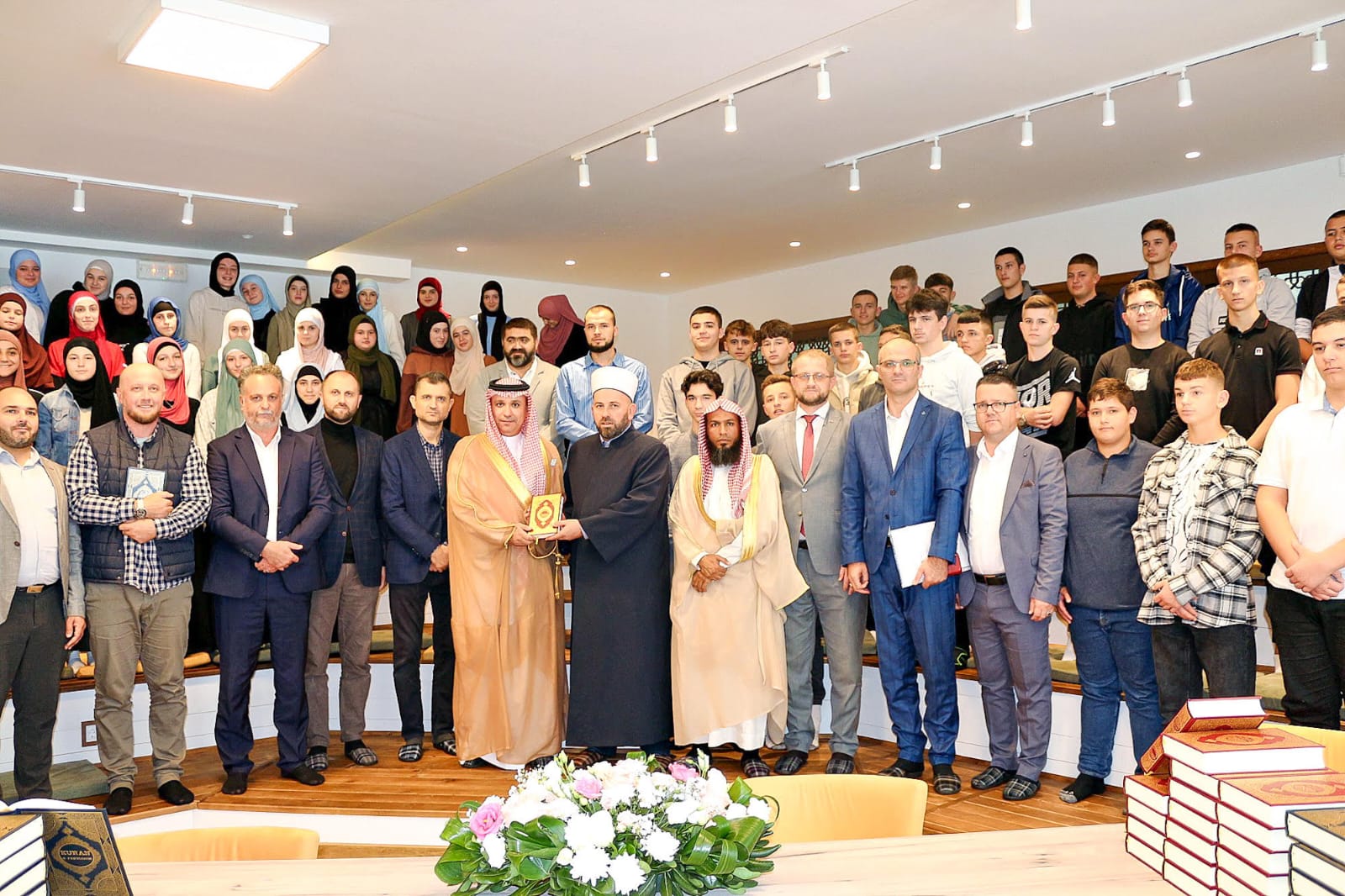 وقال: “أتشرف في هذا اليوم المبارك ونيابةٍ عن معالي وزير الشؤون الإسلامية والدعوة والإرشاد والمشرف العام على مجمعالملك فهد لطباعة المصحف الشريف الشيخ الدكتور عبداللطيف بن عبدالعزيز آل الشيخ بتدشين هدية مولاي خادم الحرمينالشريفين الملك سلمان بن عبدالعزيز آل سعود حفظه الله من المصاحف والبالغ عددها خمسين ألف نسخة من معاني القرآنالكريم باللغتين البوسنية والألبانية”.