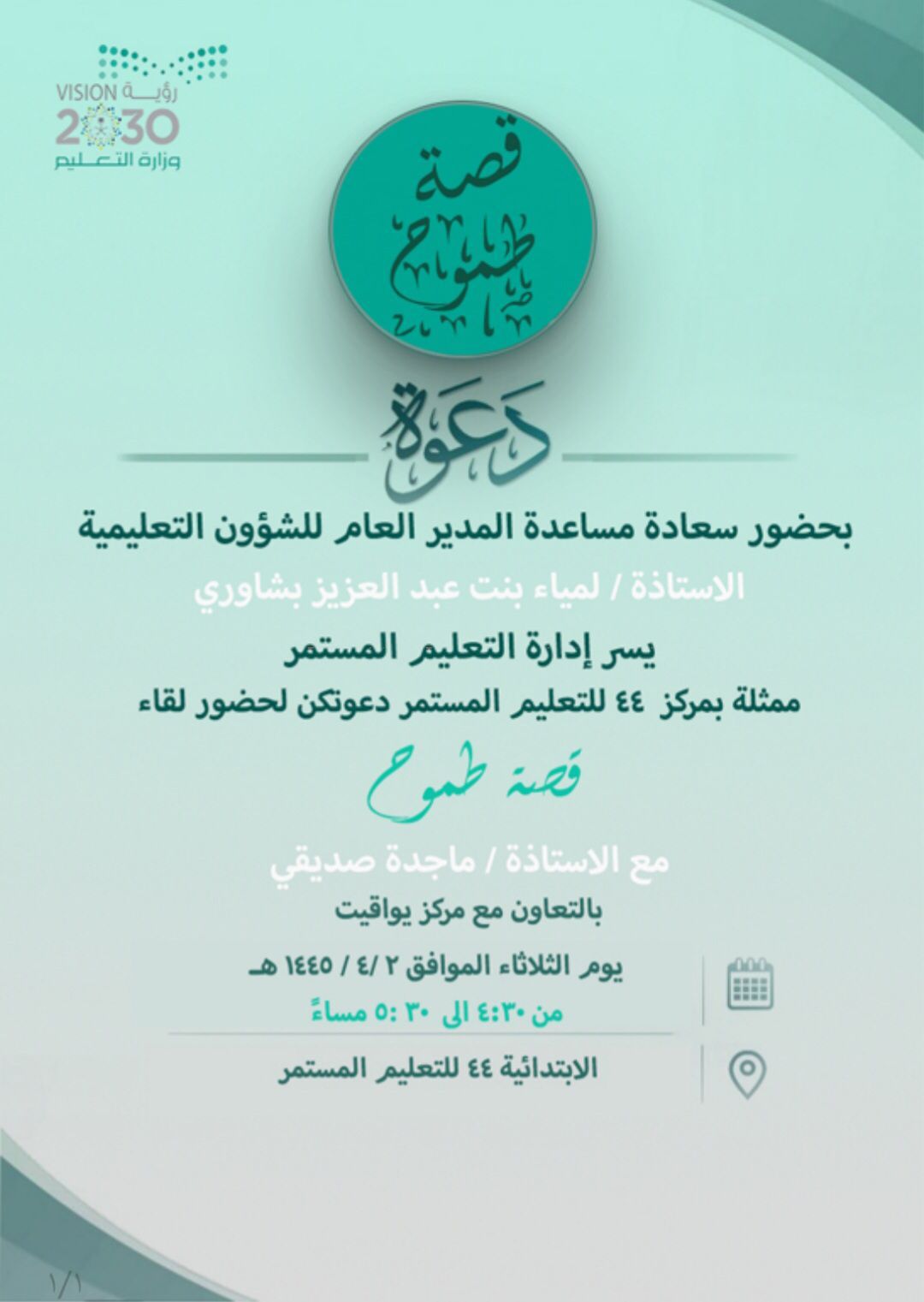 بحضور المساعدة للشؤون التعليمية أ. لمياء بشاوري؛ عقدت الإدارة العامة للتعليم بمنطقة مكة المكرمة ممثلةً في إدارة التعليم المستمر – المركز الرابع والأربعون للتعليم المستمر – لقاءً تحت شعار ” قصة طموح” ، نفذه مكتب يواقيت للاستشارات التربوية والتعليمية ممثلا في الأستاذة ماجدة صديقي بالشراكة مع جمعية التنمية الأهليّة بالشوقيّة وذلك تحت إشراف مديرة إدارة التعليم المستمر دلال اللحياني .
