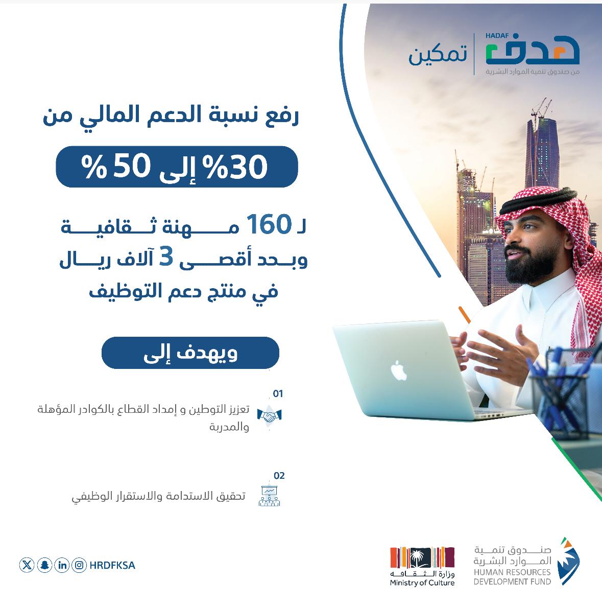 أعلن صندوق تنمية الموارد البشرية وبالتعاون مع وزارة الثقافة؛ عن رفع نسبة الدعم المالي في منتج دعم التوظيف من 30 في المائة إلى 50 في المائة وبحد أقصى 3 آلاف ريال، وذلك في 160 مهنة ثقافية في 286 نشاطاً؛ لتعزيز الاستدامة المهنية وتحقيق الاستقرار الوظيفي في قطاع العمل الثقافي.