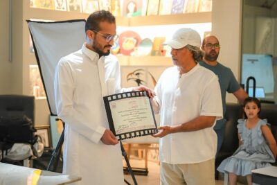 وفي نهاية الورشة كرم مشرف لجنة التصوير مفرح السويلمي الشريك والداعم للورشة كوفي قافية لاونج بدرع بهذة المناسبة.