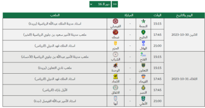 ويلتقي في المواجهة الثانية عند الساعة 5:45 فريقي الخليج وضمك على أستاد مدينة الأمير سعود بن جلوي في(الخبر) ويستضيف في المواجهة الثالثة والأخيرة من هذا الدور عند الساعة 9:00 مساءً فريق الهلال الحزم على أستاد الملك فهد الدولي في العاصمة ” الرياض”.