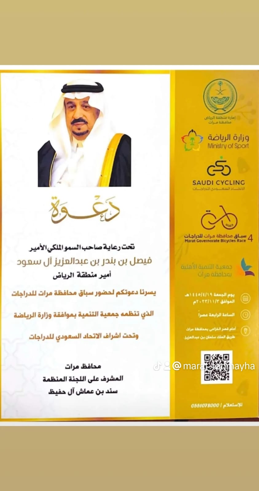 برعاية صاحب السمو الملكي الأمير فيصل بن بندر أمير منطقة الرياض ينطلق سباق محافظة مرات للدراجات ، الذي تنظمه جمعية التنمية الاجتماعية بمرات ، موافقة وزارة الرياضة وتحت إشراف الاتحاد السعودي للدراجات ، بمشاركة دول الخليج ، عصر يوم الجمعة ٢٠٢٣/١١/٣م.