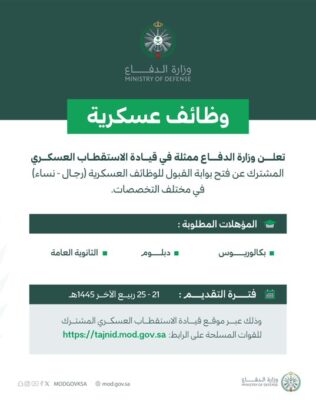 كشفت وزارة الدفاع، ممثلة في قيادة الاستقطاب العسكري المشترك، عن فتح باب القبول للوظائف العسكرية (رجال – نساء) في مختلف التخصصات.