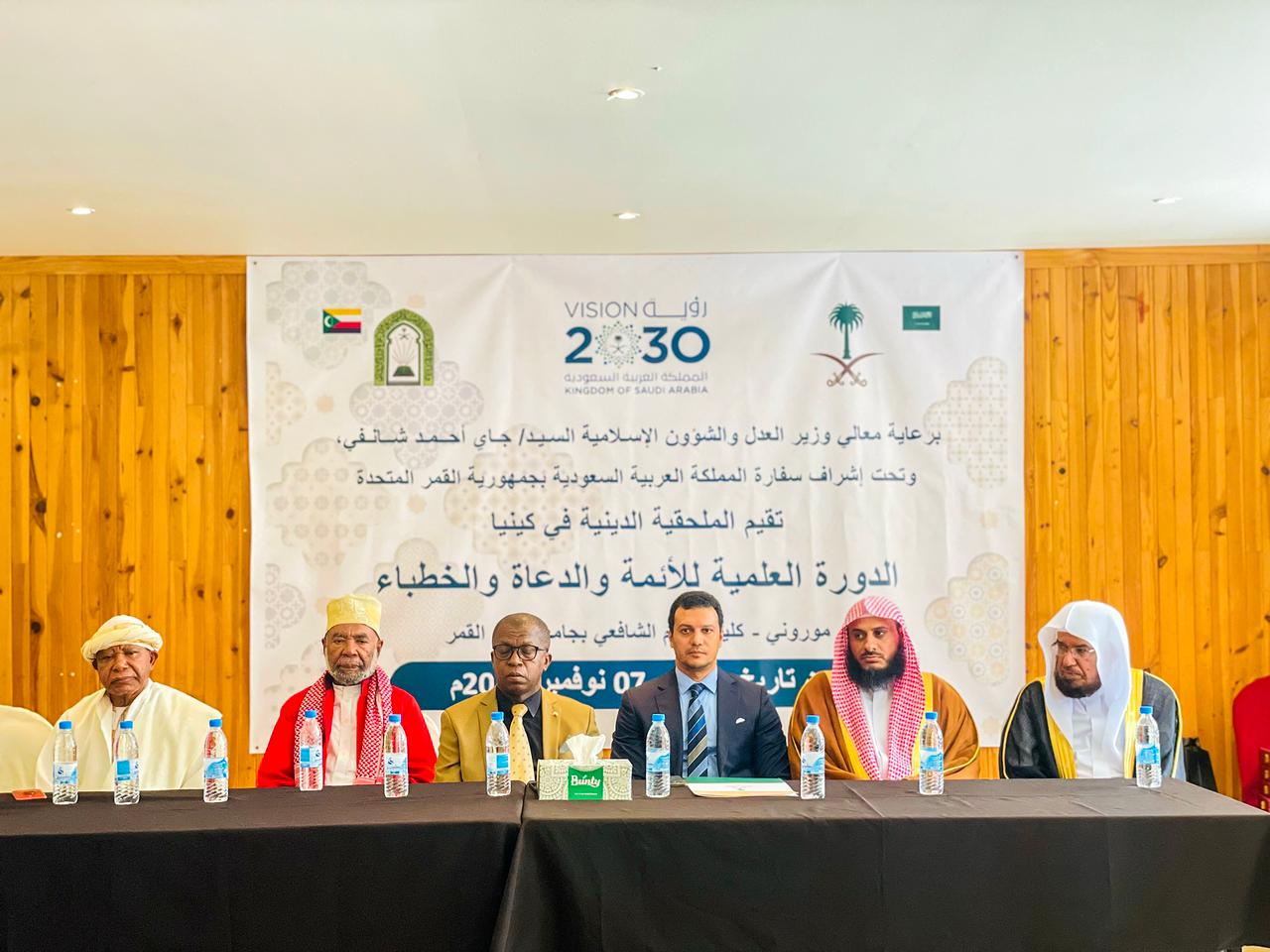 اختتمت وزارة الشؤون الإسلامية أمس الثلاثاء الموافق الثالث والعشرين من شهر ربيع الآخر 1445هـ، في موروني عاصمة جمهورية القمر المتحدة، الدورة العلمية لتأهيل الأئمة والخطباء التي نظمتها الوزارة ، واستمرت لمدّة أربعة أيام وذلك بحضور نائب سفير خادم الحرمين الشريفين لدى جمهورية القمر المتحدة الأستاذ وليد موصلي ووزير العدل والشؤون الإسلامية بجمهورية القمر المتحدة جاي أحمد شانفي ومفتي الجمهورية الشيخ أبو بكر سيد عبدالله جمل الليل.