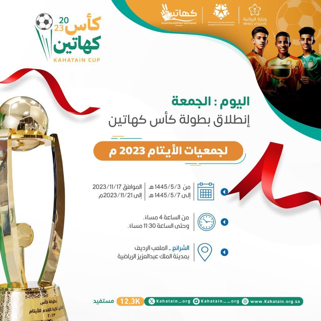 تفتتح عند الثامنة مساء غد الجمعة، بطولة كأس كهاتين لجمعيات الأيتام لكرة القدم في مدينة الملك عبد العزيز الرياضية بالشرائع، بحضور عدد من المسؤولين واللاعبين السابقين والحاليين المشاركين في البطولة.