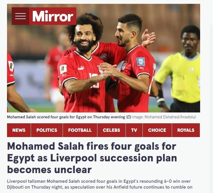 قالت صحيفة «ميرور» الإنجليزية: «نجم ليفربول محمد صلاح سجل أربعة أهداف في فوز مصر الساحق على جيبوتي 6-0 مساء الخميس، مع استمرار التكهنات حول مستقبله في ملعب أنفيلد».