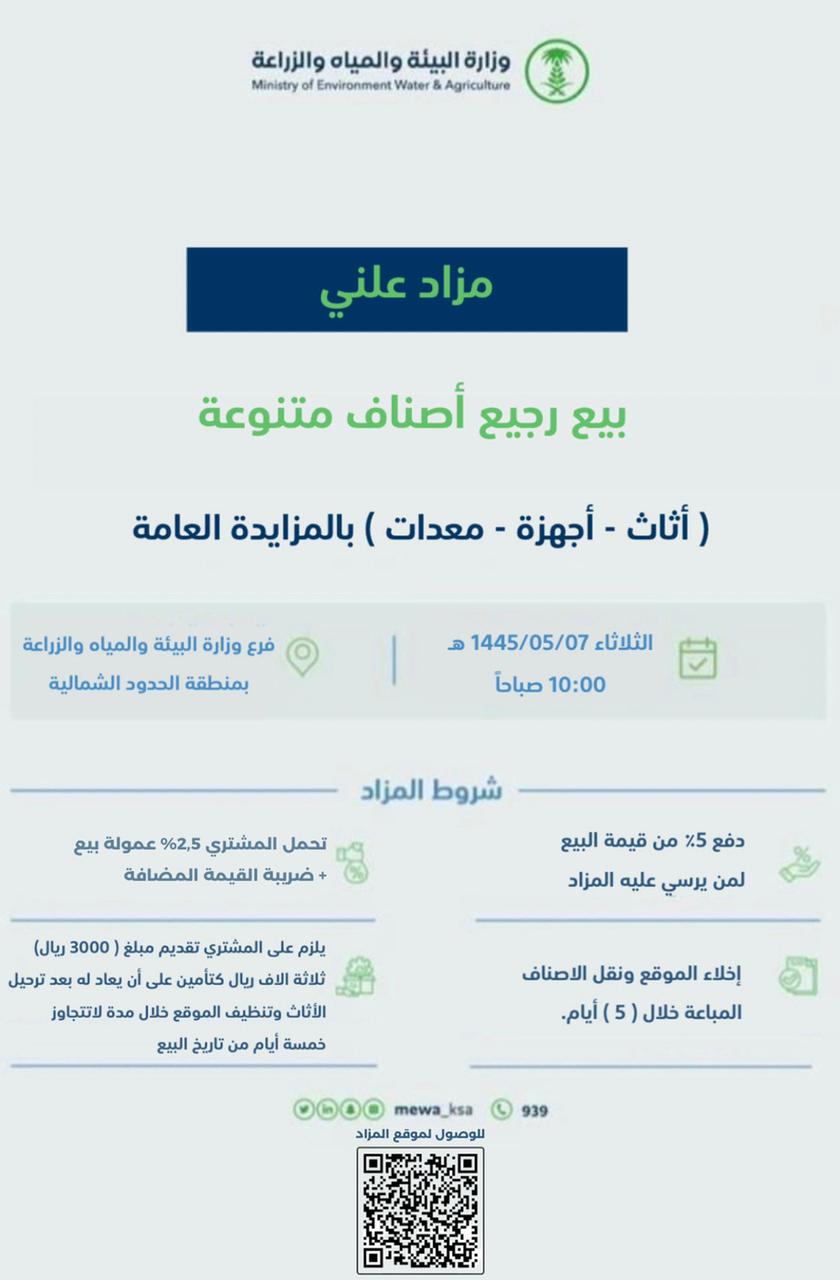 يُعلن فرع وزارة البيئة والمياه والزراعة بمنطقة الحدود الشمالية عن إقامة مزاد علني يوم الثلاثاء الموافق 1445/05/07هـ في مقر الفرع لبيع أصناف متنوعة ( أثاث – أجهزة – معدات ) وفقًا لضوابط واشتراطات المزاد الذي سيستمر حتى انتهاء الكمية . وأوضح الفرع أن المزاد يبدأ في تمام الساعة 09:30 صباحاً ، وعلى من يرغب في دخول المزاد الحضور في الزمان والمكان المحددين، على أن يدفع (5%) من قيمة البيع لمن يرسى عليه المزاد ، كما يجب عليه نقل الاصناف المباعة خلال (5) أيام ويتحمل المشتري عمولة البيع بواقع (2,5٪) ويُلزم المشتري تقديم مبلغ ( 3000 ريال) ثلاثة الاف ريال كتأمين على أن يعاد له بعد ترحيل الأثاث وتنظيف الموقع خلال مدة لا تتجاوز خمسة أيام من تاريخ البيع .