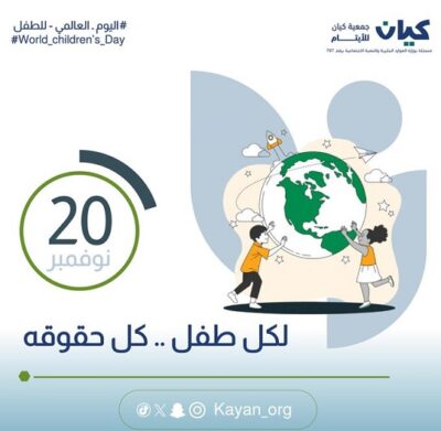 بمناسبة اليوم العالمي للطفل وبما أن جمعية “كيان” للأيتام ذوي الظروف الخاصة مجهولي الأبوين تهتم اهتماما كبيرا بتنمية وتمكين مستفيديها من الأبناء والبنات الأيتام ، وهمها الوحيد أن يكونوا أعضاء فاعلين في مجتمعهم ، من خلال الحفاظ على حقوقهم ، والاهتمام بكل صغيرة وكبيرة تخصهم ، لذا في هذا اليوم العالمي للطفل والذي تحتفل فيه دول العالم أجمع، يحق لجمعية كيان أن نرفع لها “القبعة عاليا” على كل ما تقدمه لأبنائها الأيتام ، بهذا اليوم العالمي للطفل.