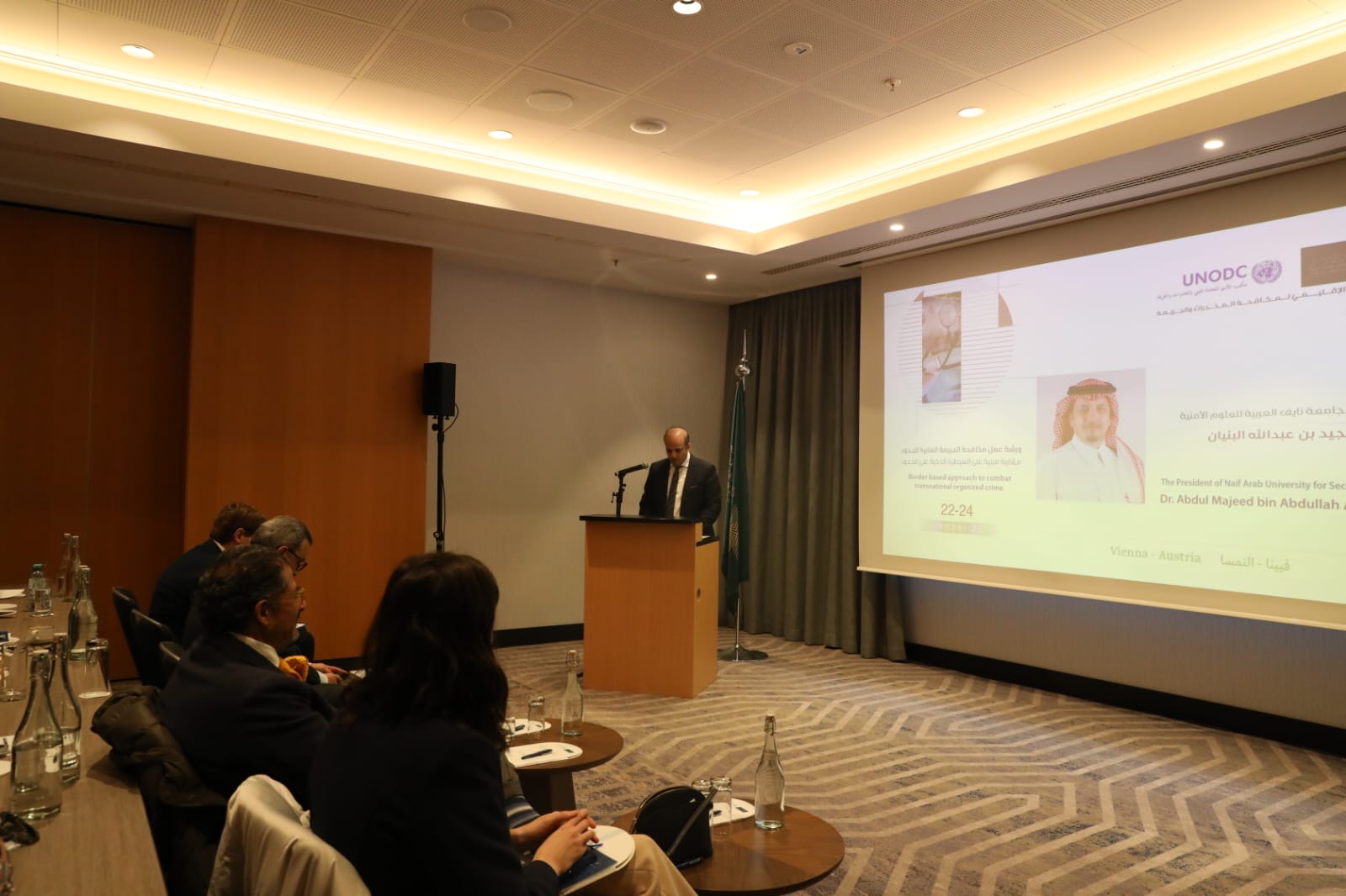 جاء ذلك خلال كلمة معاليه في افتتاح فعاليات ورشة “مكافحة الجريمة العابرة للحدود: مقاربة مبنية على السيطرة الذكية على الحدود” التي بدأت اليوم في فيينا، بحضور وكيل الجامعة للعلاقات الخارجية خالد الحرفش، والممثل الإقليمي لمكتب الأمم المتحدة المعني بالمخدرات والجريمة في الخليج العربي القاضي الدكتور حاتم علي، ورئيس فرع إدارة الحدود في مكتب unodc آلان كول، وتستمر خلال الفترة من 22 إلى 24 نوفمبر 2023م، بالتعاون مع مكتب الأمم المتحدة المعني بالمخدرات والجريمة في إطار الشراكة الإستراتيجية بين الجانبين، وضمن نطاق اتفاقية التعاون المشترك التي نُفذ من خلالها العديد من المناشط الأكاديمية والتدريبة والبحثية في المجالات الأمنية والعدلية.