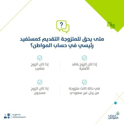 حدد برنامج حساب المواطن أربع حالات تتيح للسيدة المتزوجة التسجيل في البرنامج كمستفيد رئيسي.