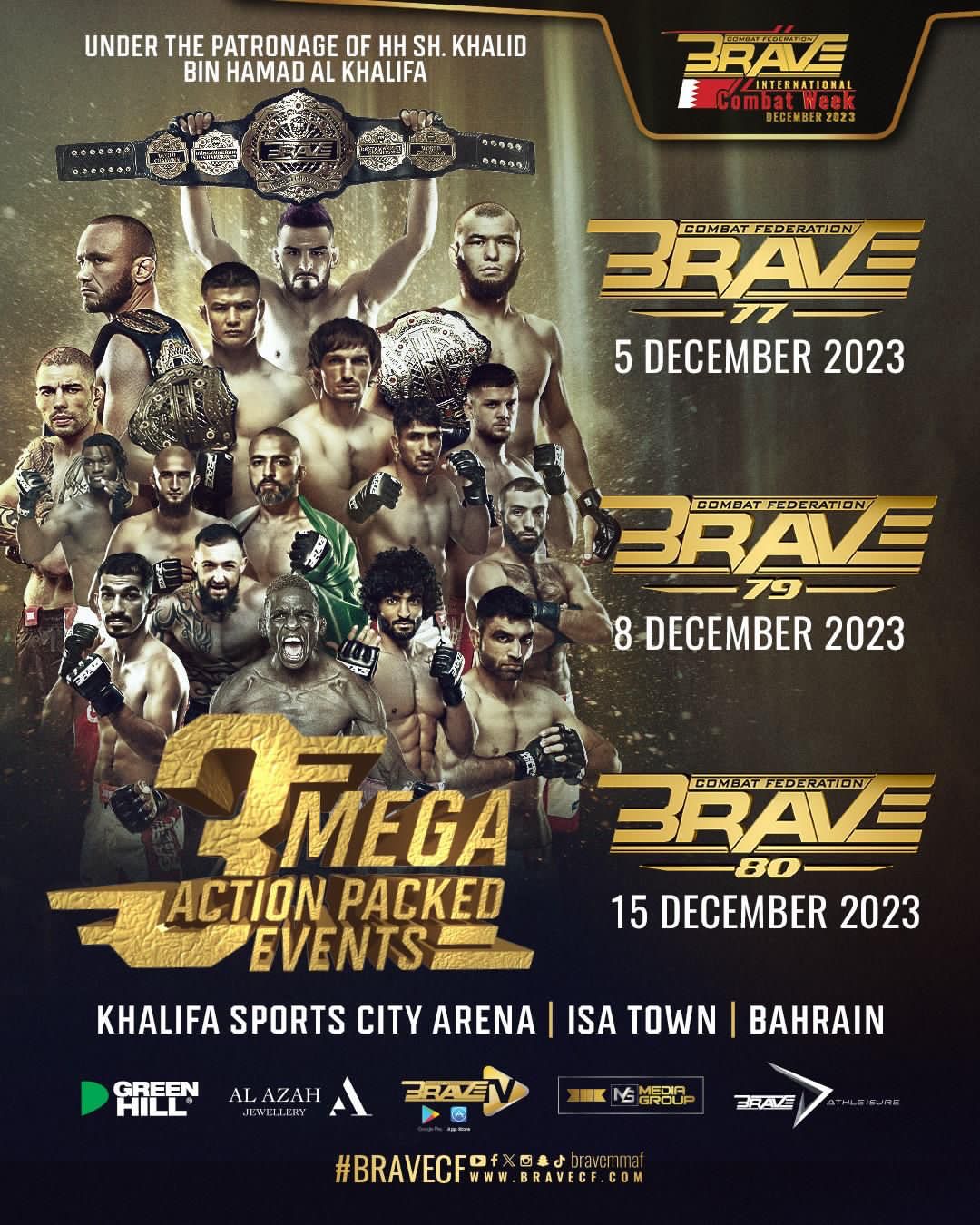وبحسب جدول فعاليات أسبوع بريف الدولي للقتال 2023 في مملكة البحرين، ستقام بطولة BRAVE CF 79 للمحترفين يوم 8 ديسمبر، وتقام بطولة BRAVE CF 80 للمحترفين يوم 15 ديسمبر، ويشهد هذا الحدث الدولي الكبير إقامة النسخة الرابعة لبطولة آسيا لفنون القتال المختلطة للهواة في الفترة 10- 16 ديسمبر.