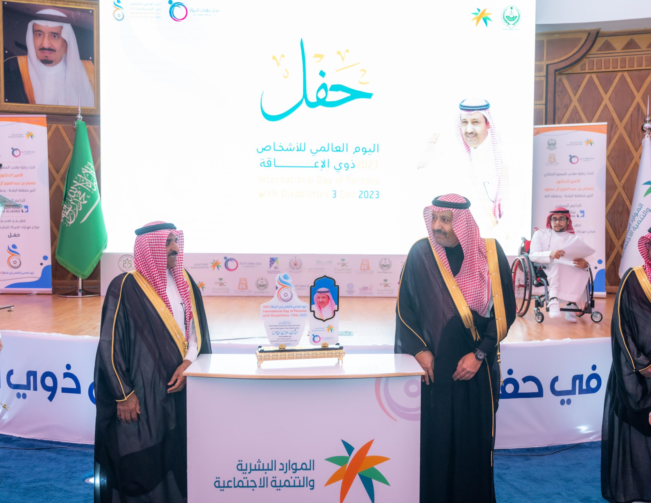 رعى صاحب السمو الملكي الأمير الدكتور حسام بن سعود بن عبدالعزيز أمير منطقة الباحة اليوم, حفل اليوم العالمي للأشخاص ذوي الإعاقة, الذي ينظمه فرع وزارة الموارد البشرية والتنمية الاجتماعية بالمنطقة بالشراكة مع مركز مهارات الحياة للرعاية النهارية, وذلك بقاعة الحسام للمعارض والمؤتمرات بالباحة.