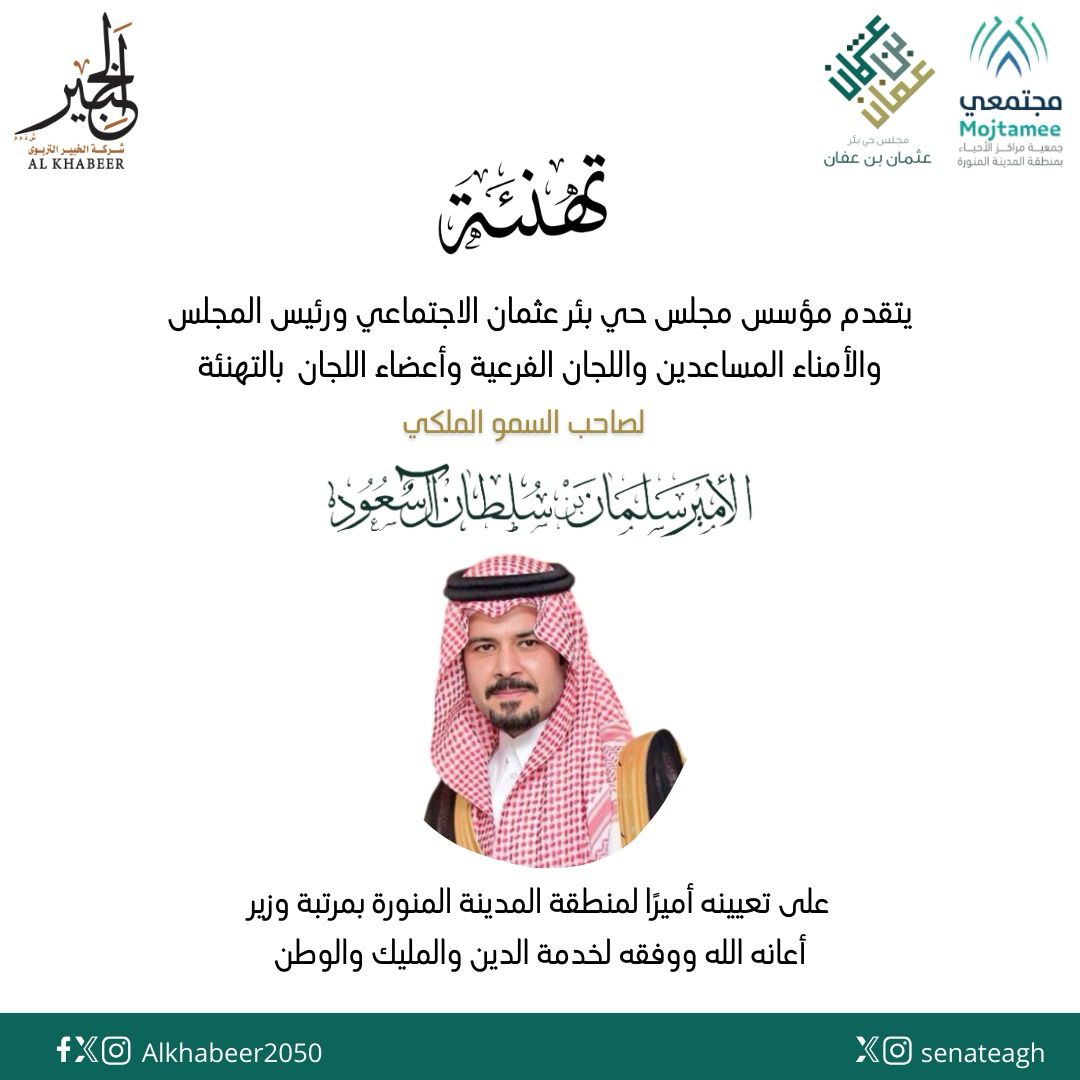 قدم مؤسس مجلس حي بئر عثمان الاجتماعي و رئيس المجلس و الأمناء المساعدين و اللجان الفرعية و أعضاء اللجان بالتهنئة لصاحب السمو الملكي الأمير سلمان بن سلطان آل سعود على تعينه أميرا لمنطقة المدينة المنورة بمرتبه وزير ، داعيين الله  أن يعينه الله ويوفقه لخدمة الدين و المَلِكْ و الوطن