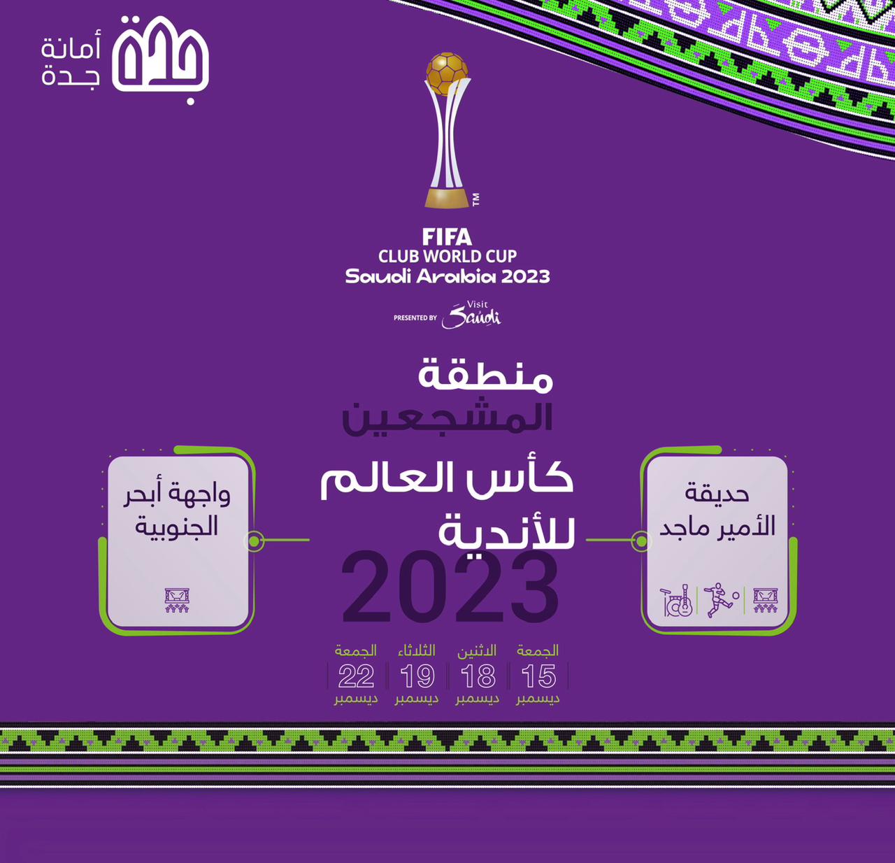 تزامناً مع بطولة كأس العالم للأندية 2023، المقامة بمدينة جدة، تقيم أمانة جدة فعاليات تفاعلية تهدف إلى إثراء تجربة المشجعين في البطولة، بشاطئ أبحر الجنوبية وحديقة الأمير ماجد