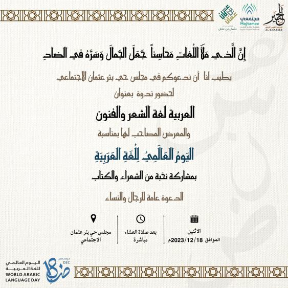 مواكبة للأيام العالمية، و تحقيقا للأهداف المرسومة ضمن خطة يعمل عليها رئيس مجلس حي بئر عثمان الاجتماعي بالمدينة المنورة البروفسور محمد أديب، ورعاية كريمة من الوالد الشيخ عبد الغني حسين كما عود الجميع ، و مع مجلس تنفيذي مخلص و أعضاء متفاعلين ؛ ينفذ المجلس ندوة بعنوان “العربية لغة الشعر و الفنون” مع معرض مصاحب للفعالية.