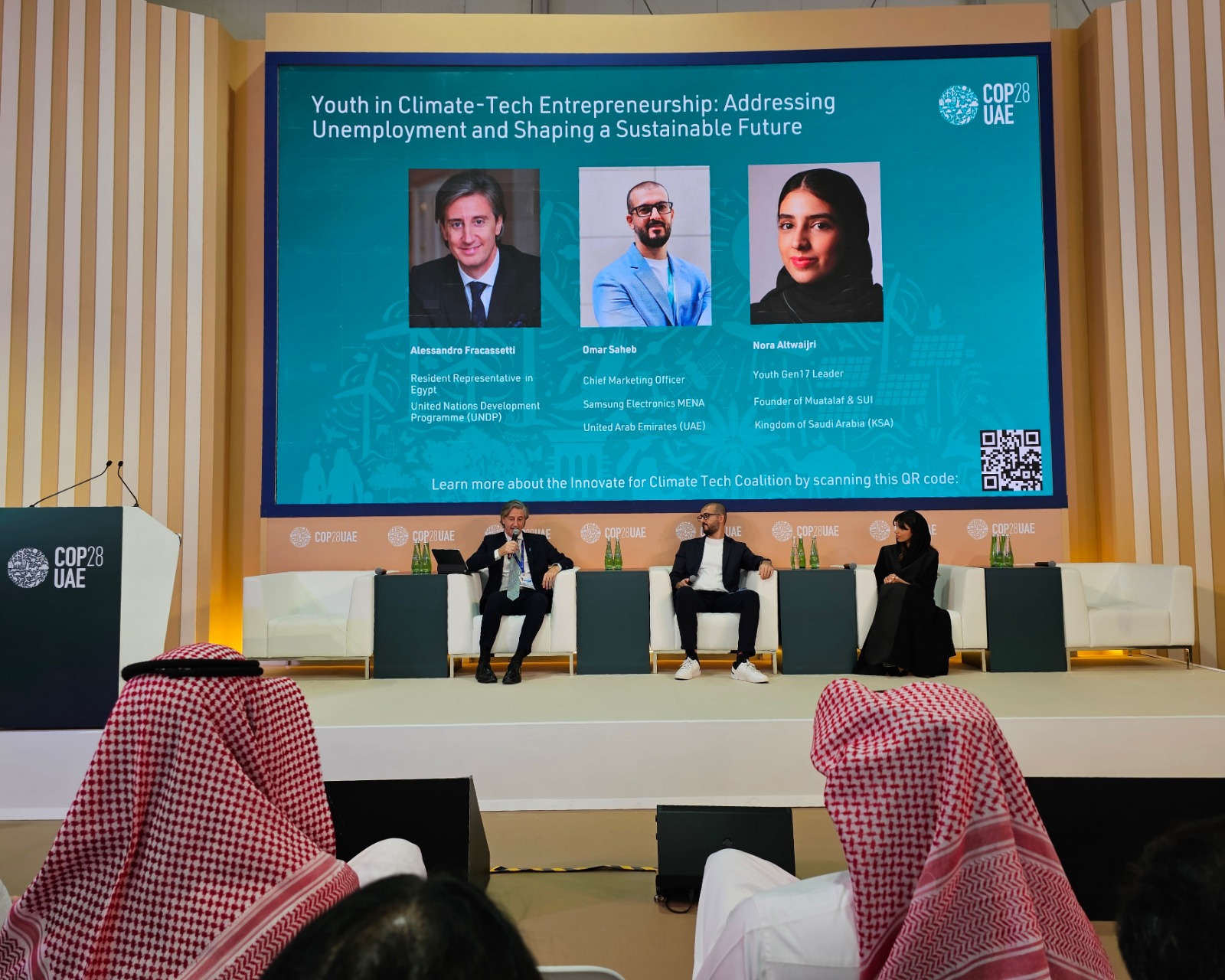تم الإعلان عن الفعالية خلال جلسة حوارية رفيعة المستوى جمعت مسؤولي سامسونج وبرنامج الأمم المتحدة الإنمائي كجزء من الأنشطة القائمة بمناسبة مشاركتهما في مؤتمر الأطراف (COP28). وشارك في الجلسة كل من عمر صاحب، الرئيس التنفيذي للتسويق في سامسونج الشرق الأوسط وشمال إفريقيا؛ وأليساندرو فراكاسيتي، الممثل المقيم لبرنامج الأمم المتحدة الإنمائي في جمهورية مصر العربية؛ ونورا التويجري، وهي قيادية شابة في برنامج “جيل ١٧” التابع للأمم المتحدة الإنمائي/ سامسونج، من الرياض، المملكة العربية السعودية.