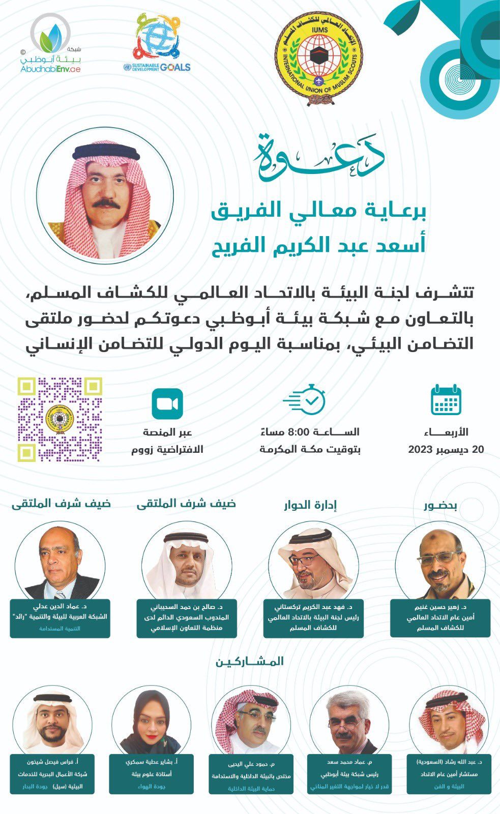 برعاية معالي الفريق أسعد عبدالكريم الفريح ،تنفذ لجنة البيئة بالاتحاد العالمي للكشاف المسلم، بالتعاون مع شبكة بيئة  ابوظبي ملتقى التضامن البيئي، وذلك بمناسبة اليوم الدولي للتضامن الإنساني، بحضور أمين عام الاتحاد العالمي للكشاف المسلم سعادة الدكتور زهير حسين غنيم، وذلك مساء الأربعاء 20 ديسمبر 2023 ، الساعة 8:00 مساء بتوقيت مكة المكرمة