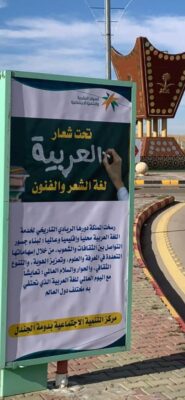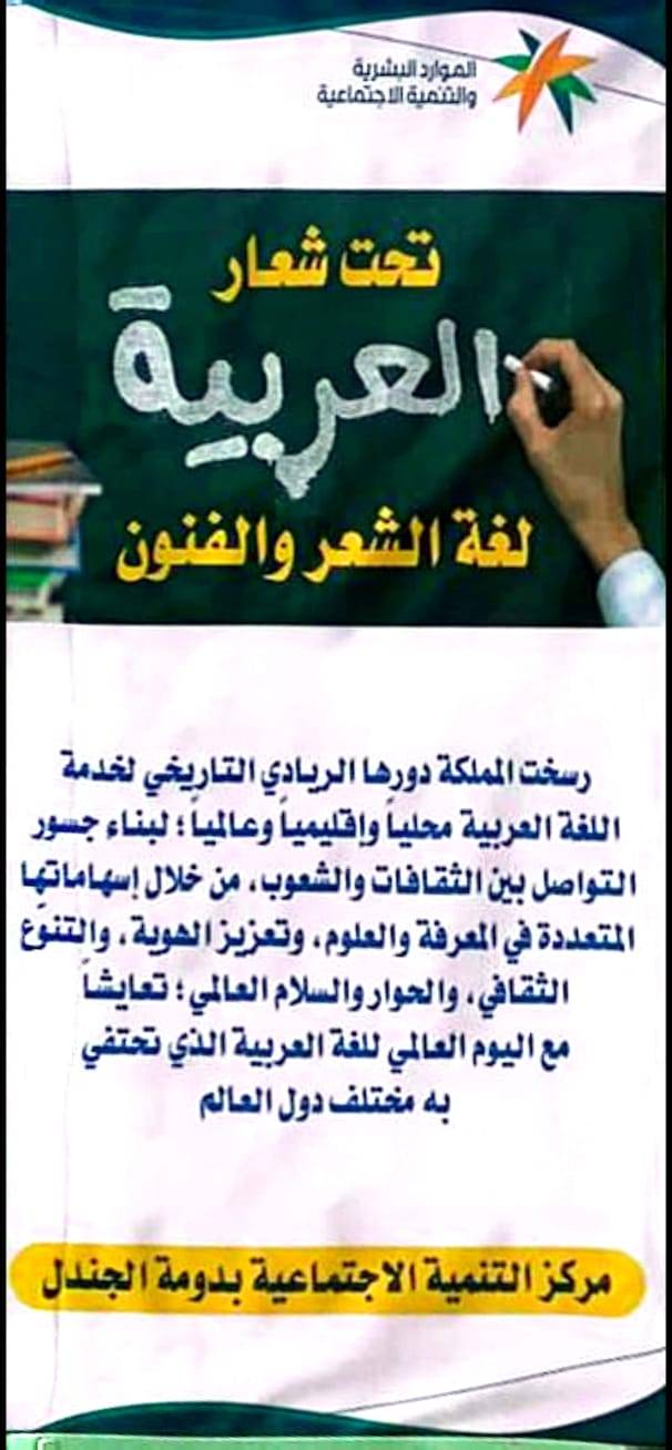 قام مركز التنمية الاجتماعية بمحافظة دومة الجندل بتفعيل اليوم العالمي للغة العربية الذي يصادف اليوم الاثنين الموافق 5/6/1445 ، وذلك بوضع لوحات توعوية عن أهمية اللغة العربية والعمل على تطويرها في الميادين العامة والطرقات الرئيسية بمحافظة دومة الجندل .