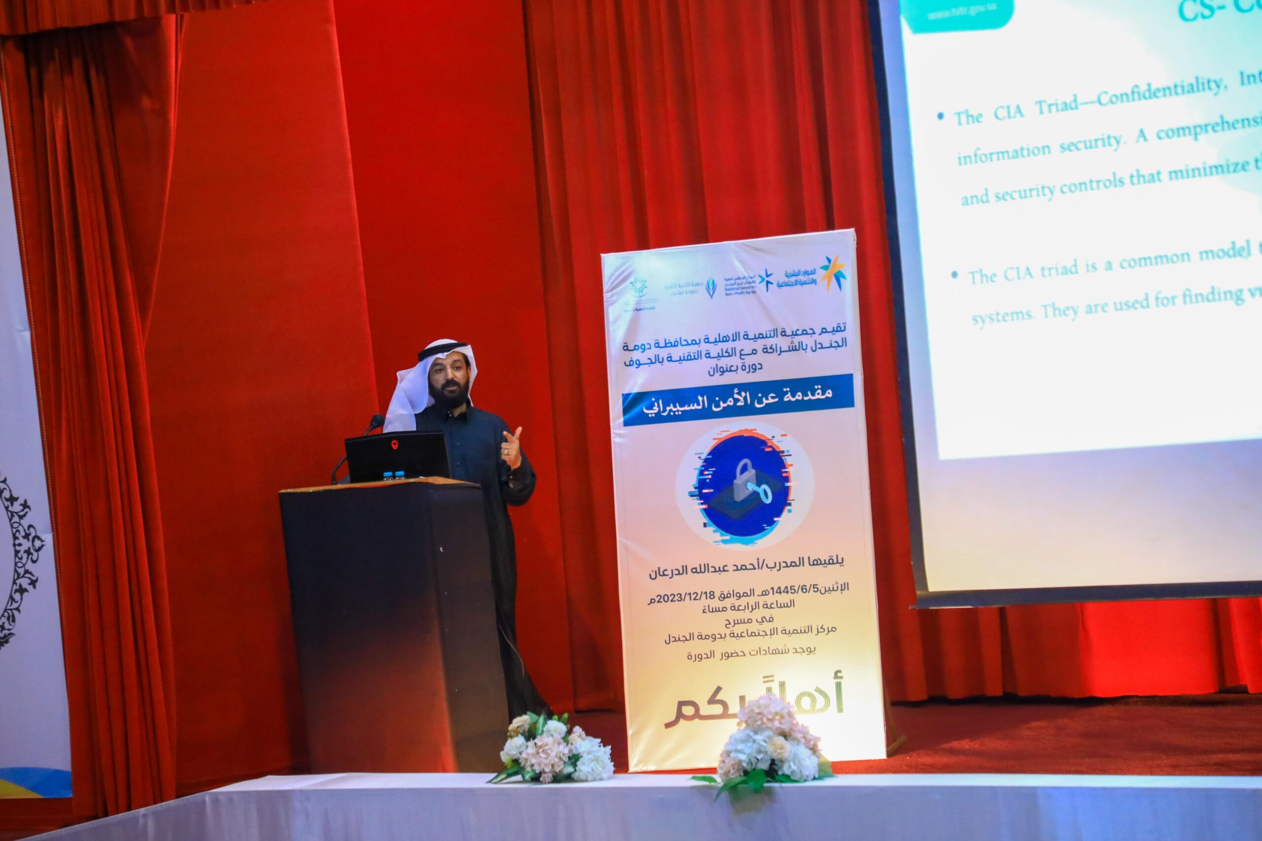 أقامت جمعية التنمية الأهلية بدومة الجندل يوم الأثنين الموافق ١٤٤٥/٦/٥هـ دورة بعنوان الأمن السيبراني بالشراكة مع الكلية التقنية بالجوف يلقيها المدرب بالكلية احمد عبدالله الدعان .