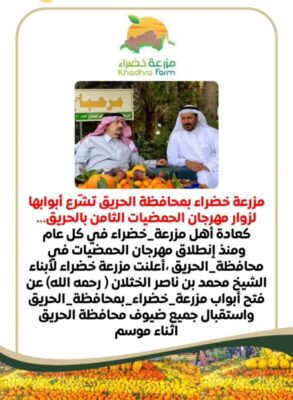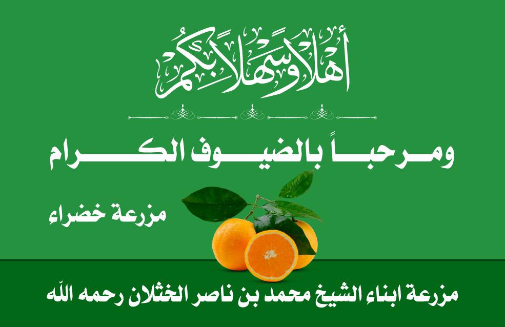 جريا مثل كل عام تتشرف مزرعة خضراء لابناء محمد بن ناصر الخثلان ( رحمه الله) بفتح مزرعة خضراء بمحافظة الحريق واستقبال جميع ضيوف محافظة الحريق اثناء موسم مهرجان الحمضيات الثامن بالمحافظة والذي سيعقد بمشيئة الله خلال الفترة من تاريخ٢١- ٦-١٤٤٥هـ ،حتى ١-٧-١٤٤٥هـ الموافق ( ٣ / ١/ ٢٠٢٤ م إلى ١٣ / ١/ ٢٠٢٤ م.