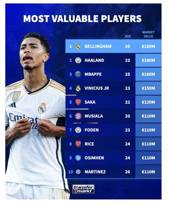 أفاد موقع “ترانسفر ماركت” العالمي بأن النجم الإنجليزي جود بيلينغهام لاعب خط وسط فريق ريال مدريد الإسباني لكرة القدم، أصبح أغلى لاعب في العالم من حيث القيمة السوقية مع نهاية 2023.
