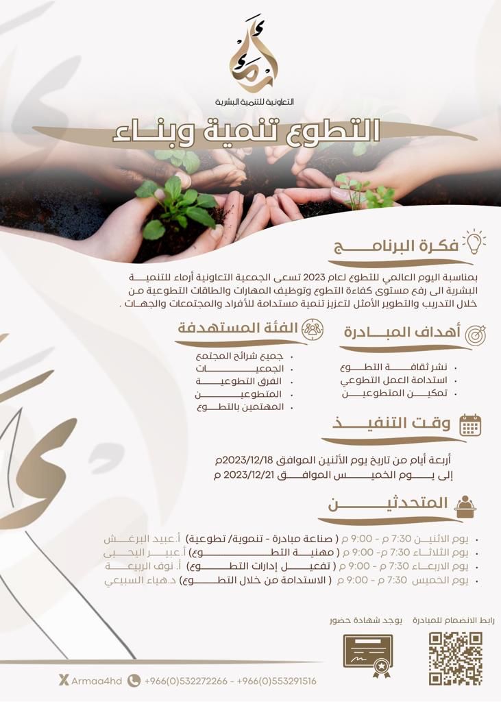 اختتمت الجمعية التعاونية أرماء للتنمية البشرية مبادرة التطوع (تنمية وبناء) والتي تم تفعيلها بمناسبة اليوم العالمي للتطوع، حيث قدمت الجمعية عددًا من اللقاءات التطويرية والتوعوية، ووأوضحت أهمية العمل في مجال التطوع ،وقائدي التطوع ،ولم تكتفِ المبادرة بهذه الشريحة، ولكن امتدت لإدارات التطوع بالقطاع الثالث، وقدمت اللقاءات عن طريق الشريك التقني (منصة جهات) وبرامج الزووم ،حيث كان الحضور مميزًا وفعالًا في هذه المبادرة ،والتي توالت على مدى أربعة أيام متواصلة، وقد تحدث كل من: الأستاذ عبيد البرغش ،والدكتور عبدالعزيز الشهري والأستاذة نوف الربيعة ،والدكتوره هيا السبيعي
