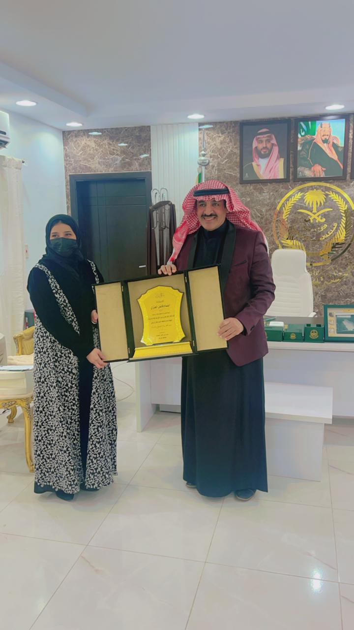 وفي الختام كرم سعادته الاستاذه ابتسام فاضل بدرع تذكاري بناء على جهودها واشاد سعادته بالشراكة المجتمعية لما فيها من اوجه التعاون بما يخدم المجتمع واستدامةً للتطور.