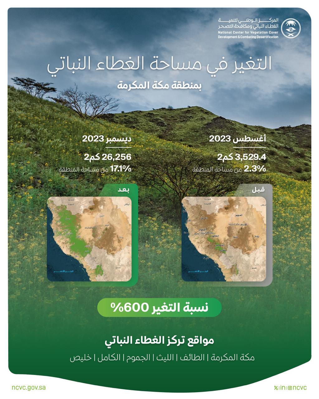 كشف المركز الوطني لتنمية الغطاء النباتي ومكافحة التصحر، عن زيادة مساحات الغطاء النباتي في منطقة مكة المكرمة بنسبة بلغت 600% خلال الأشهر الخمسة الأخيرة، بدايةً من أغسطس 2023 إلى ديسمبر، بسبب الحالة المطرية في هذه الفترة التي وصلت معدلاتها إلى 200 ملم في بعض المواقع.