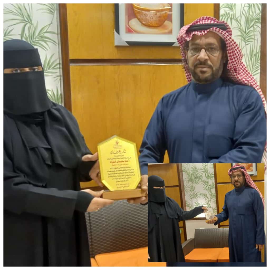 وقام قائد فريق هُمام التطوعي بالجوف الأستاذ عبدالعزيز عطيه العنزي بتسليم الدروع نيابة عن الدكتورة أنوار الدوسري والتي نقل فيها تقدير د. أنوار على الجهود التي تم بذلها خلال عام 2023 ، و شكرها لجميع أعضاء فريق هُمام التطوعي بالجوف ، وتطلعها إلي بذل المزيد خلال عام 2024.