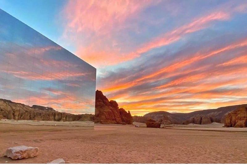 أصبحنا نجوب ونتفقد المكعب وكأننا من العصور الوسطى القديمة لنرى الجمال والإبداع وكأننا نغرق في مراياه الكبيرة مكعب مزج بين الصحراء وكأنه عالم متصل بين الفضاء وبإرضه انعكاسات السماء وكأنها البحور العميقة.