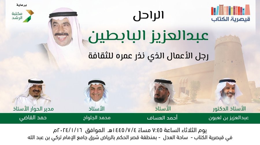 تقيم قيصرية الكتاب فعالية بعنوان ” الراحل عبدالعزيز البابطين ، رجل الأعمال الذي نذر عمره للثقافة ” برعاية مكتبة الرشد ، حيث يشارك ويتحدث فيها كل من الأستاذ الدكتور عبد العزيز بن لعبون ، والأستاذ احمد العساف والأستاذ محمد الجلواح ويدير الحوار الأستاذ والكاتب حمد القاضي وذلك في الساعة ٠٧:٤٥ مساء من يوم الثلاثاء القادم 4/7/1445 الموافق 16 يناير 2024م