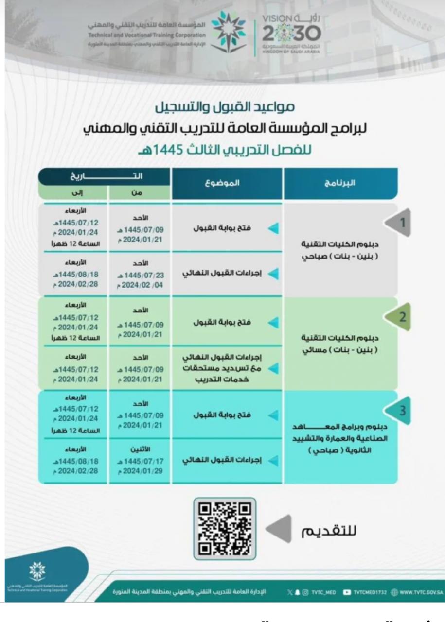 أعلنت الإدارة العامة للتدريب التقني والمهني بمنطقة المدينة المنورة عن مواعيد التسجيل والقبول في برامج الكليات والمعاهد التابعة لها بمنطقة المدينة المنورة للفصل التدريبي الثالث للبنين والبنات، اعتباراً من يوم الأحد المقبل، الموافق الـ 9 من شهر رجب الجاري.