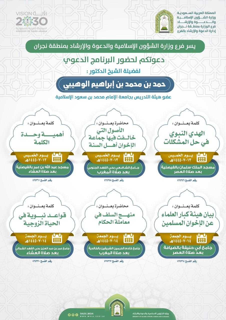 ينظم فرع وزارة الشؤون الإسلامية والدعوة والإرشاد بمنطقة نجران، يومي الثالث عشر والرابع عشر من شهر رجب الجاري، برنامجاً علمياً يتضمن عدداً من المحاضرات والكلمات الوعظية في جوامع ومساجد مدينة نجران، يلقيها عضو هيئة التدريس بجامعة الإمام محمد بن سعود الإسلامية الدكتور حمد بن محمد الوهيبي.