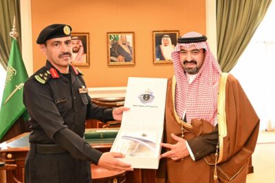 أطلع صاحب السمو الملكي الأمير خالد بن سعود بن عبدالله الفيصل بن عبدالعزيز نائب أمير منطقة تبوك على التقرير السنوي لأعمال ومهام دوريات الأمن بالمنطقة ومستجدات المهام الميدانية التي يقوم بها رجال الدوريات ومنظومة تطوير دوريات الأمن بالمنطقة وجهود الضبط الميداني الأمني . جاء ذلك خلال لقاء سموه بمكتبه بالإمارة اليوم ، مدير إدارة دوريات الأمن بمنطقة تبوك العميد عيد بن سليمان العطوي .