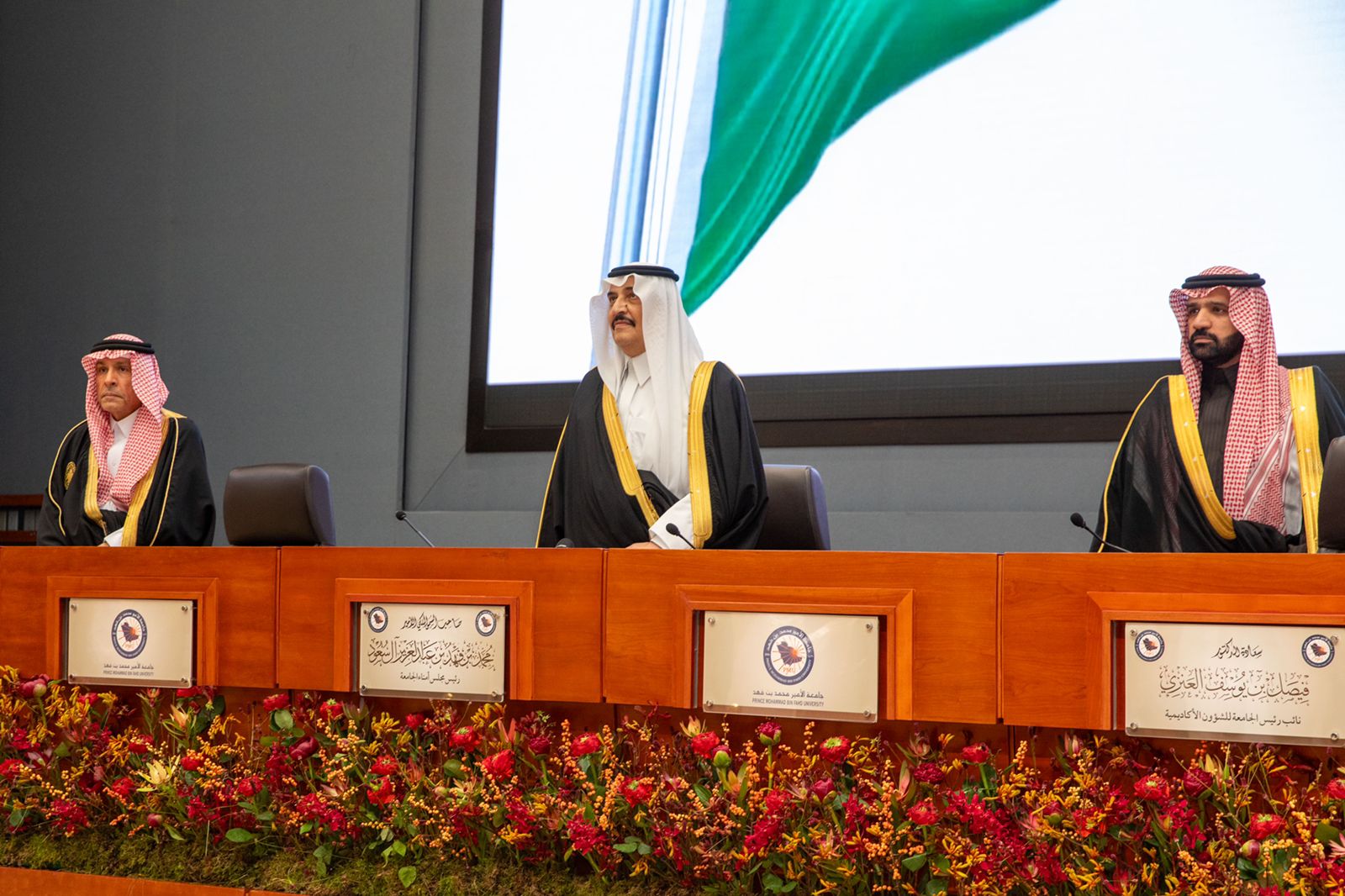 مقدمین شكرھم لسمو راعي الحفل على دعمھ ورعایتھ لھذه الجامعة إلى أن أصبحت تنافس كبریات الجامعات بالعالم. كما قدم الطلاب شكرھم لإدارة الجامعة ولأعضاء ھیئة التدریس الذین أخلصوا في بذل الجھد العلمي لتحقیق طموحاتھم وجعل الجامعة متمیزة على المستوى المحلي والعالمي.