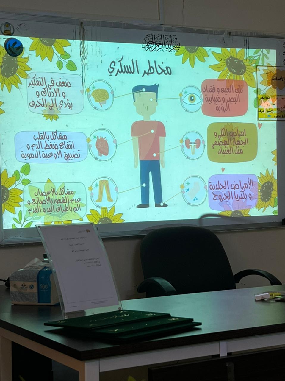 وذلك ضمن برامج وأنشطة المجتمع المحلي ، قدمتها الممرضة /العنود محمد ، والممرضة /روابي العنزي ، تطرقت في هذه المحاضره 1/تعريف مرض السكر ، وأهمية البنكرياس ، وماهو الإنسولين وأعراض مرض السكر ومخاطره وكيفية الوقاية منه وتم النقاش مع الطالبات.
