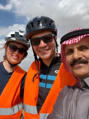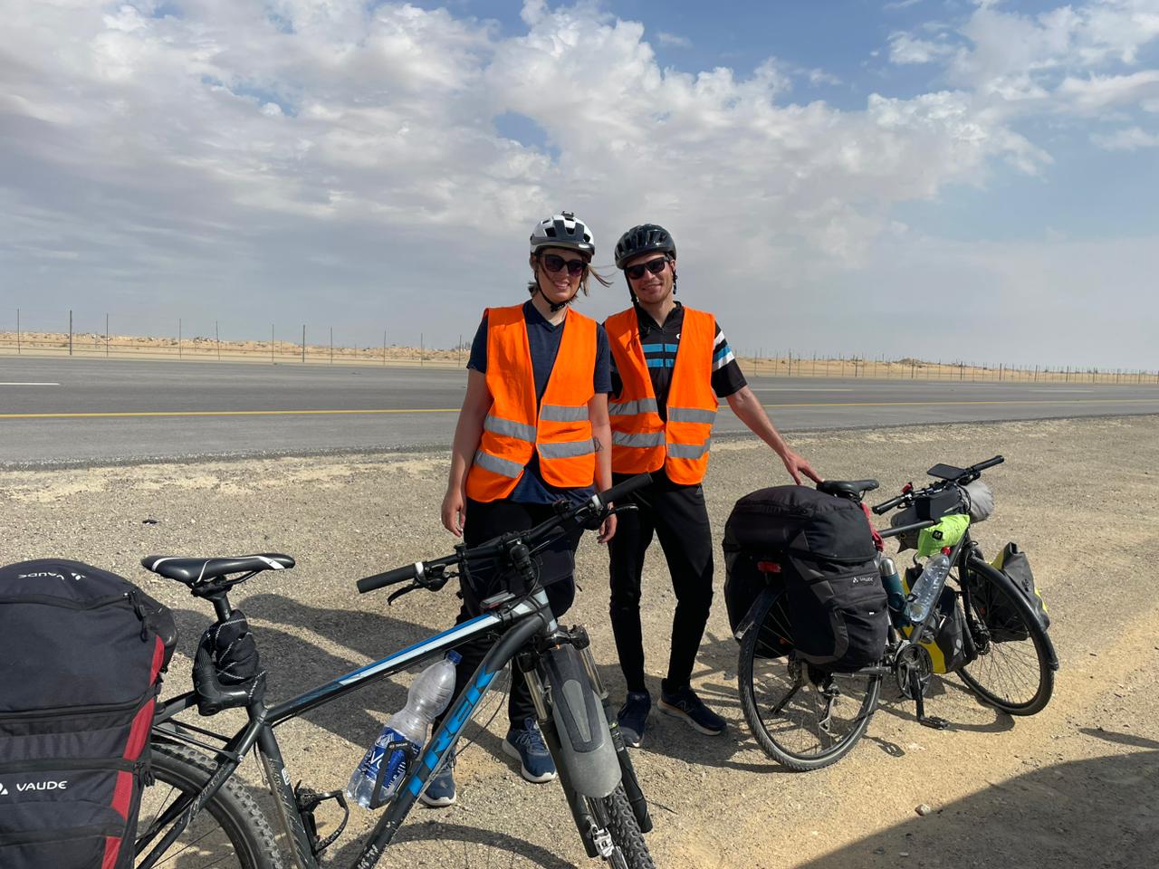 تحدث لنا آرون وزوجته في شرحهما لنا لرحلتهما المشوقة : عزيزي عبد الله، بدأنا الرحلة مباشرة من عتبة دارنا في 18 سبتمبر 2023 من برلين. ركبنا الدراجة من هناك إلى أنقرة، في تركيا. سافرنا من أنقرة إلى دولة الكويت بالطائرة ومن هناك انطلقنا بالدراجة داخل المملكة العربية السعودية من الخفجي إلى الدمام ثم البحرين وسنعود ونتابع سيرنا ، ونأمل أن نستخدم القطار في المملكة العربية السعودية أيضًا لرؤية الرياض والهفوف، وربما مدن أخرى، وجهتنا ستكون بعدها إلى دبي الإمارات العربية المتحدة،