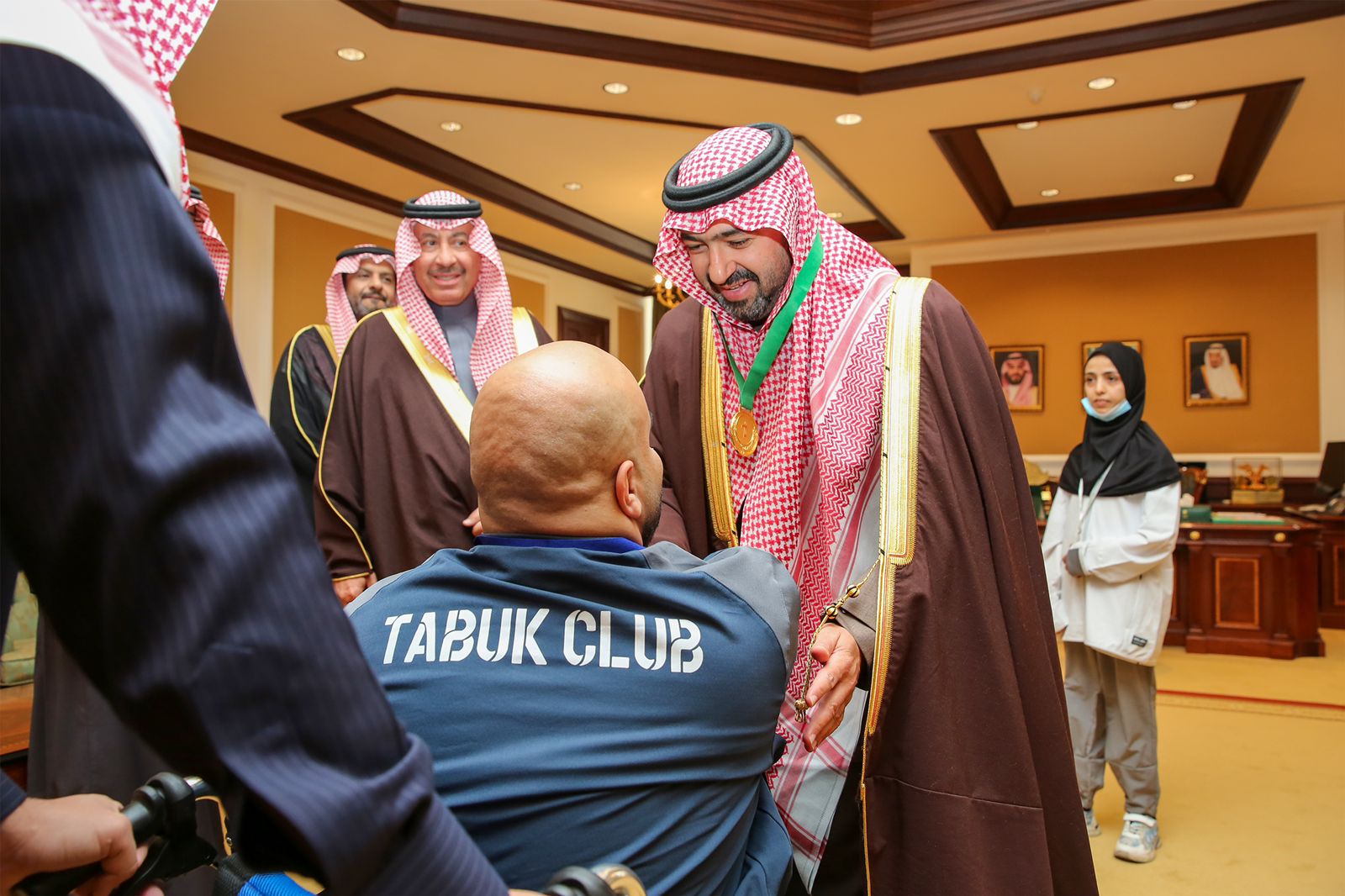 استقبل صاحب السمو الملكي الأمير خالد بن سعود بن عبدالله الفيصل بن عبدالعزيز نائب أمير منطقة تبوك، في مكتبه بالإمارة اليوم، رئيس مجلس إدارة نادى ذوى الإعاقة بمنطقة تبوك أحمد بن عطية الحارثي، يرافقه عددا من اللاعبين واللاعبات بالنادي.