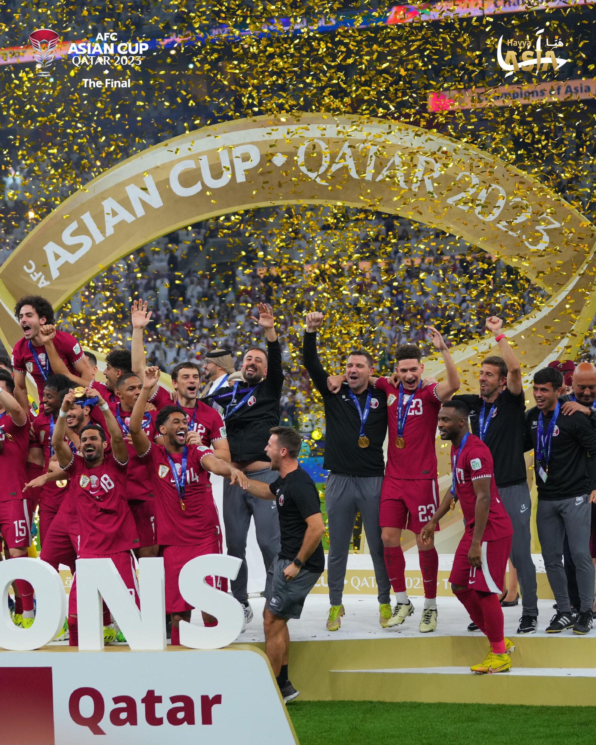 فاز المنتخب القطري بلقب كأس آسيا 2023، بعد تفوقه على نظيره الأردني بثلاثة أهداف لواحد، في المباراة النهائية التي أقيمت على أرض استاد لوسيل، مساء السبت.