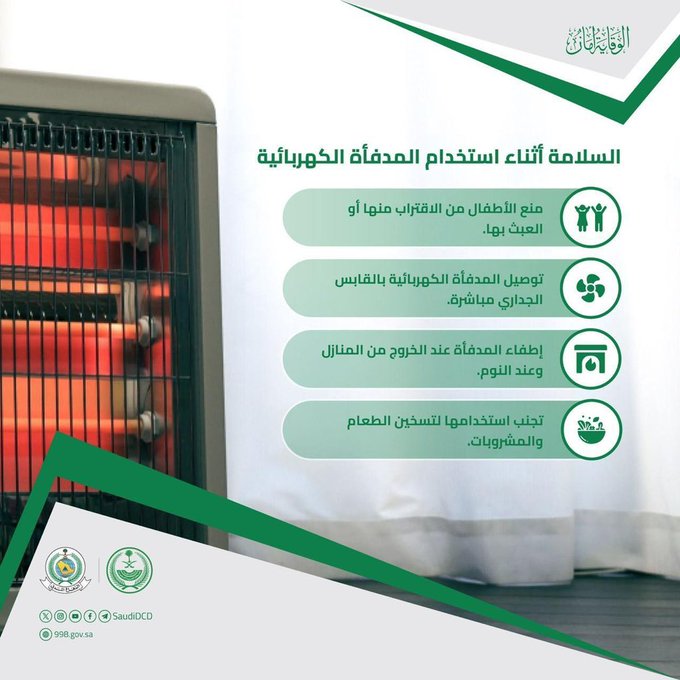 وتابعت، أن تلك الإجراءات تتضمن توصيل المدفأة الكهربائية بالمقبس الجداري مباشرة، وإطفاء المدفأة عند الخروج من المنازل وعند النوم، وتجنب استخدام المدفأة لتسخين الطعام والمشروبات.