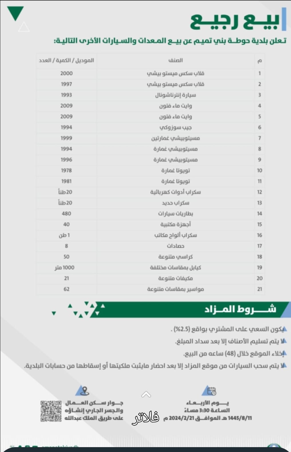 أعلنت بلدية حوطة بني تميم عن طرح مزاد علني لبيع مواد رجيع مختلفة “سيارات – معدات – سكراب”.