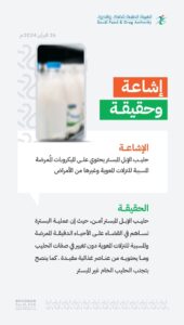 وأوضحت الهيئة أن الحليب آمن، مؤكدة أن عملية البسترة تساهم في القضاء على الأحياء الدقيقة الممرضة المسببة للنزلات المعوية دون تغيير في صفات الحليب وما يحتويه من عناصر غذائية مفيدة.